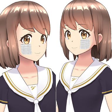 ・デカールの性質上、顔の輪郭に沿って表示されるため、歪んでみえることがあります。以下の画像を参考になるべく中央に寄せてイラストを制作してください。